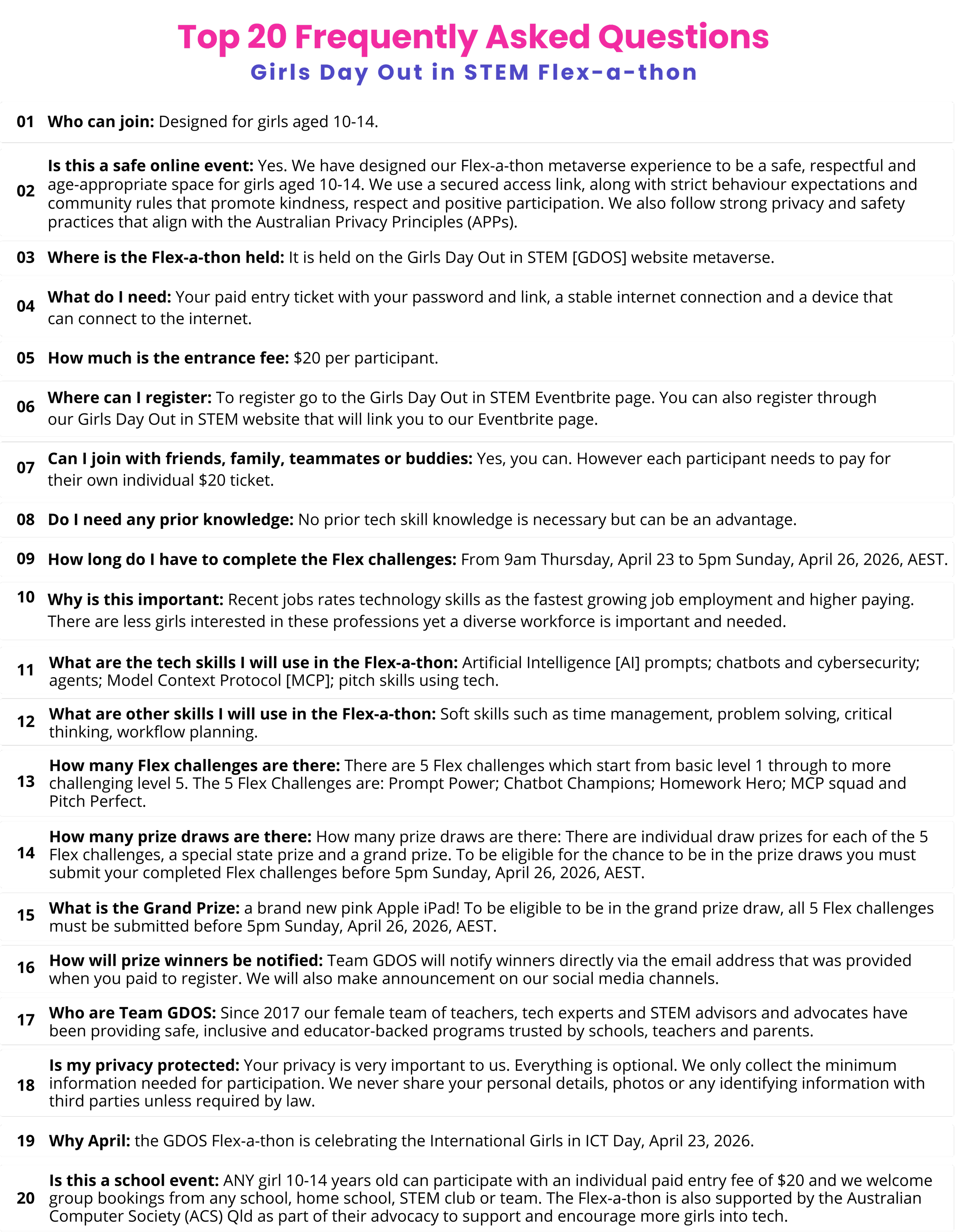 Register here via this link to our Eventbrite booking page before April 23, 2026Pay just $20 per ticket to receive your metaverse password and event access linkFrom April 23-26 come back to begin 4 days of FlexesHave fun learning tech skills and be rewarded for your work by submitting your individual Flexes to be in the draw to win awesome prizes!NEW Apple iPad! Be in the grand prize draw for your chance to win when you finish all 5 Flex challenges.SIGN UP TODAY – JUST $20 PER TICKET